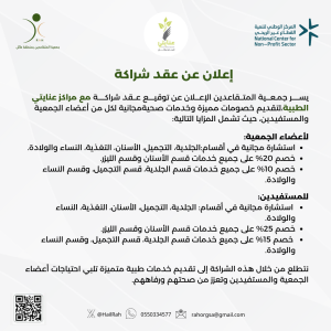 نتطلع من خلال هذه الشراكة إلى تقديم خدمات طبية متميزة تلبي احتياجات أعضاء الجمعية والمستفيدين وتعزز من صحتهم ورفاههم.